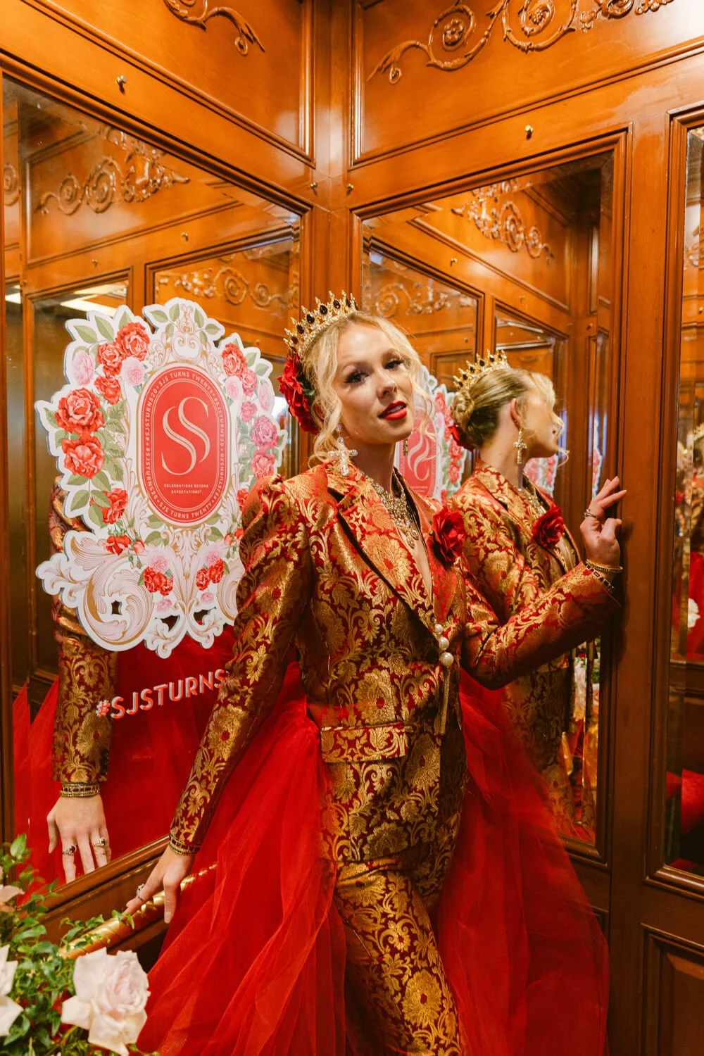 Custom Wardrobe: Twelve characters were outfitted in stunning costumes, including brocade suits, royal crowns, celestial headpieces, and floor-length gowns, all meticulously hand-embellished to reflect the event’s grand theme. Distinctive features like hand-cast baroque armor, gold-painted feather wings, custom florals, and rich red velvet draping brought a luxurious Dolce & Gabbana-inspired aesthetic to life.